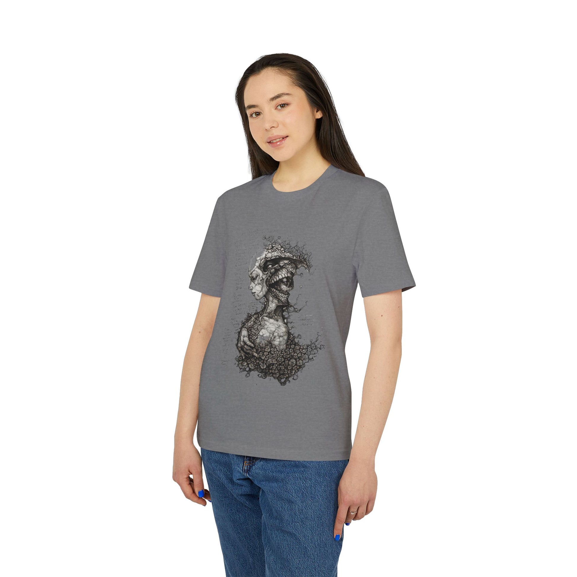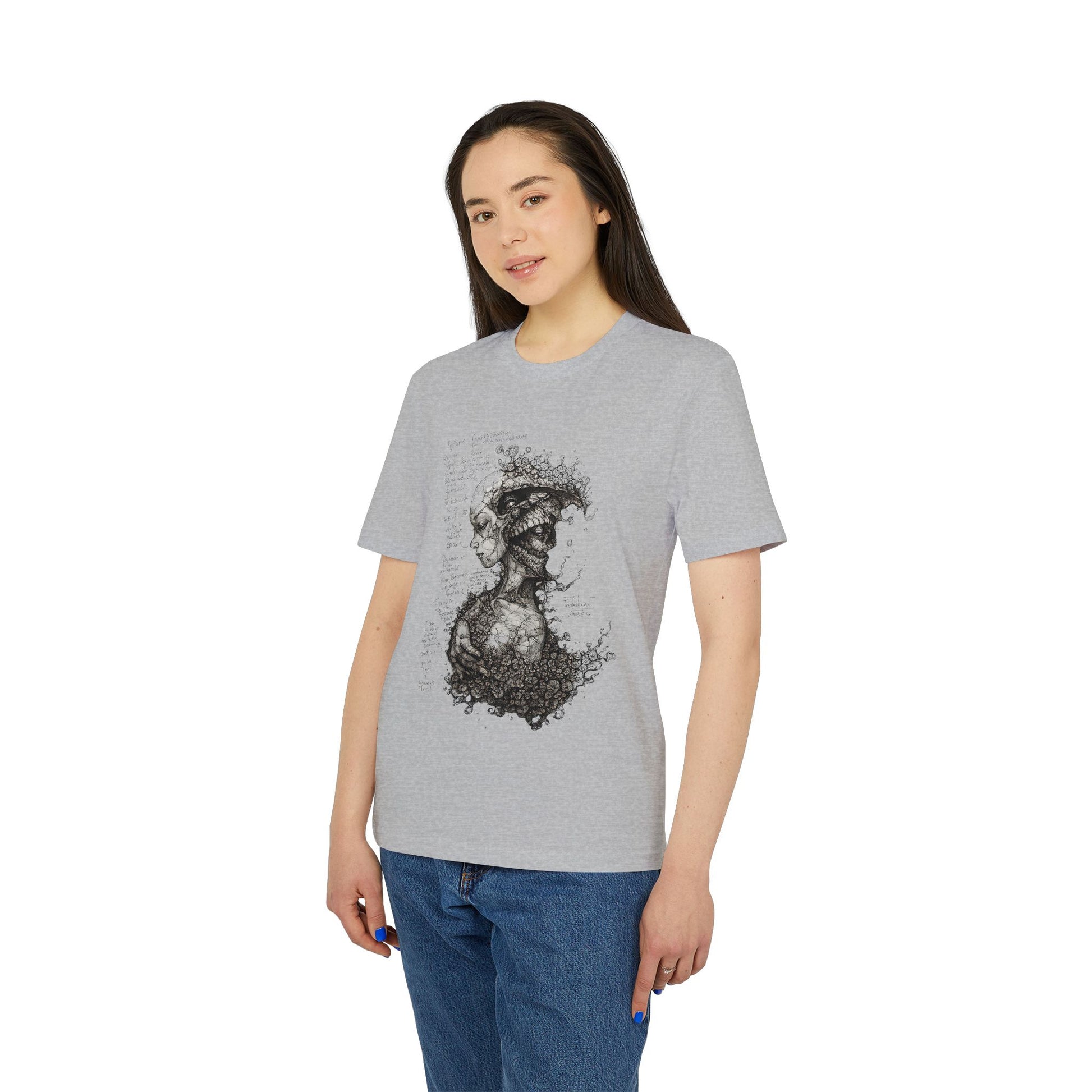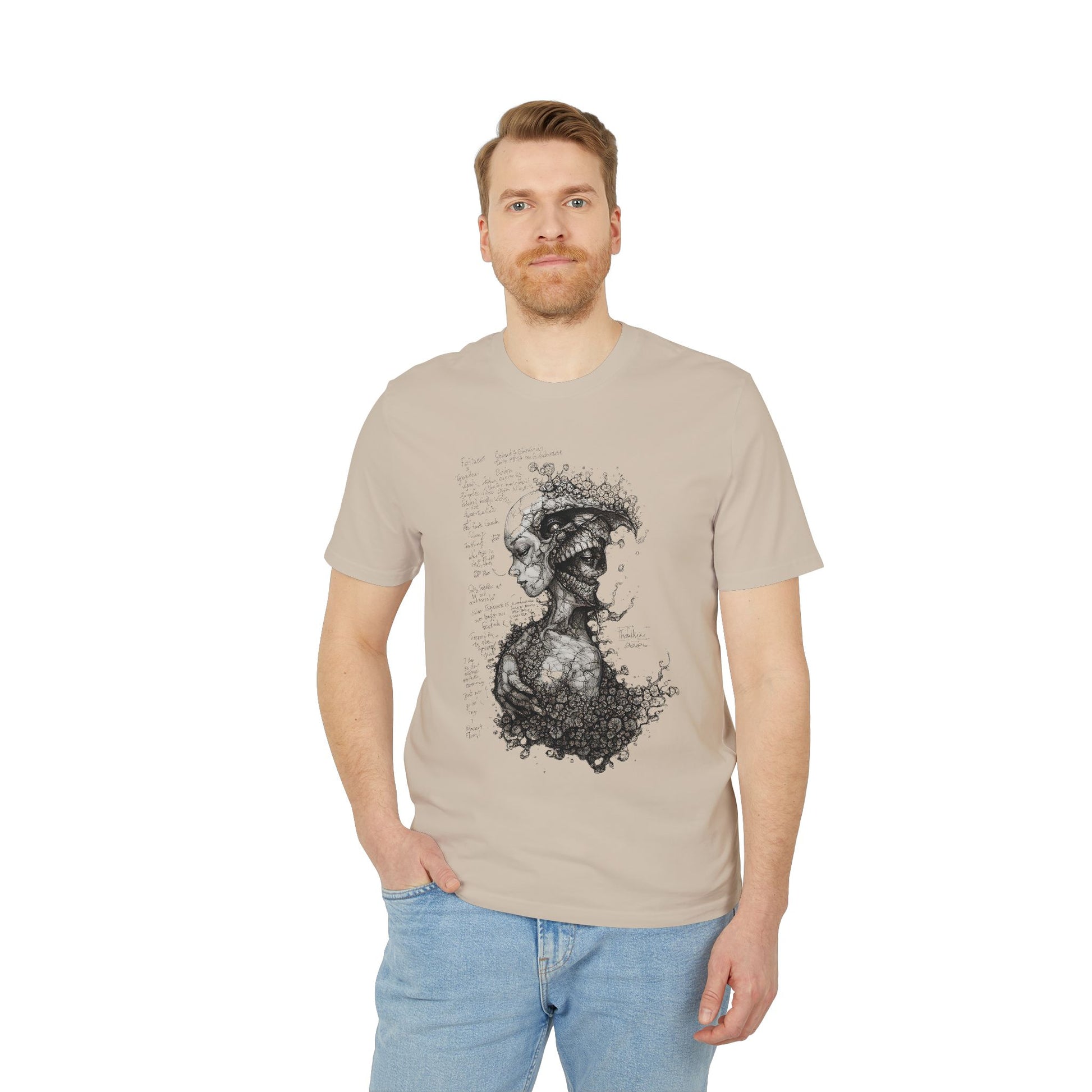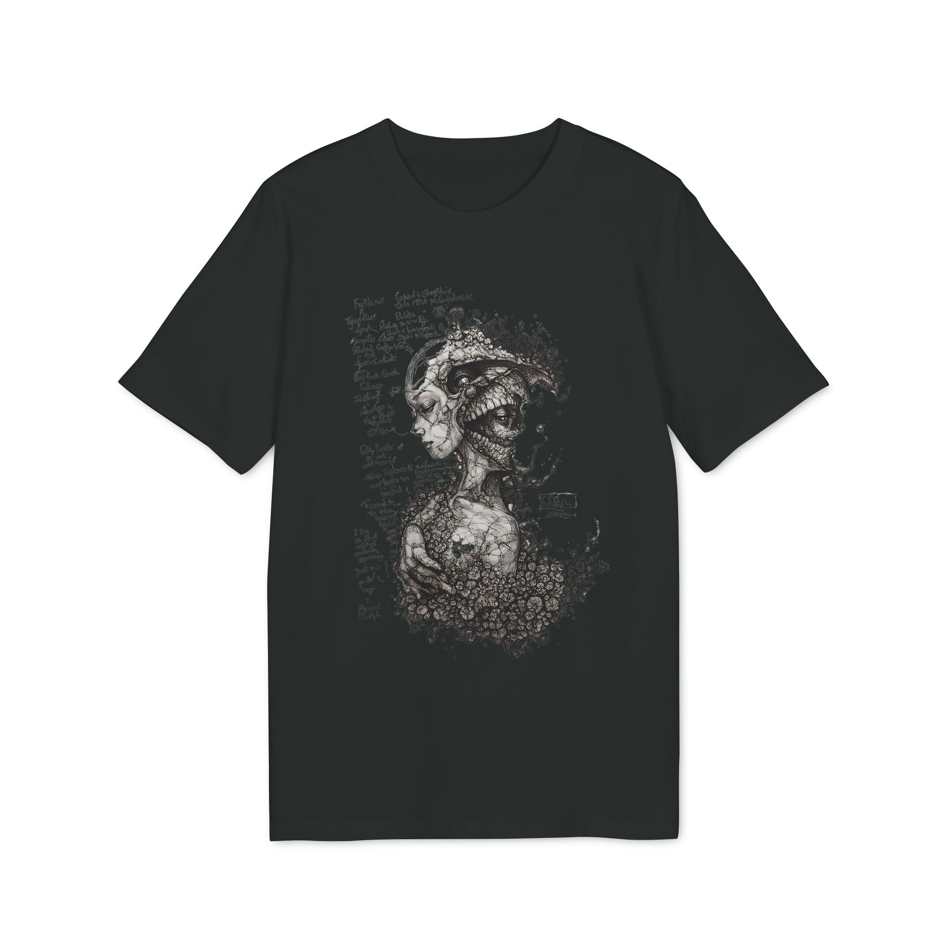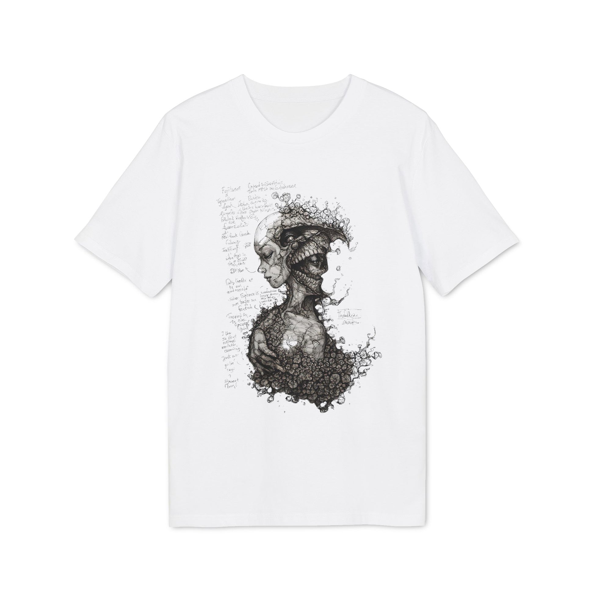 This design is drawn in meticulous pen-style texture, surrounded by cryptic handwritten notes — like a scientist documenting a dream. Printed on 100% organic cotton, this tee transforms dark surrealism into sustainable fashion. Perfect for artists, thinkers, and outsiders who find beauty in contradiction.
