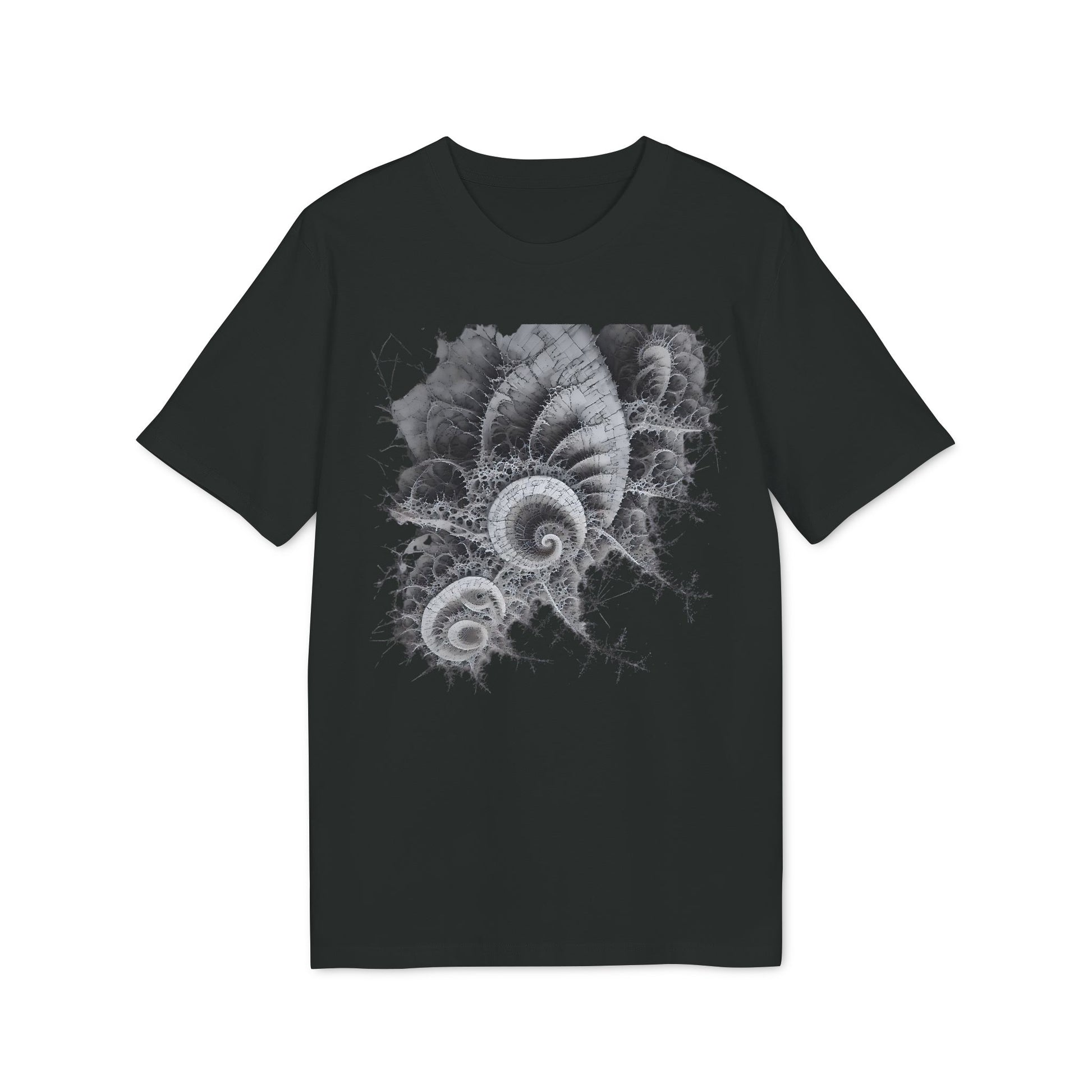 This eco-friendly unisex T-shirt features a hand-rendered fractal shell design, echoing the infinite mathematics of nature, sacred geometry, and grotesque beauty. The spirals unfold like a cosmic fossil, bridging science, art, and occult mysticism into a single wearable paradox.