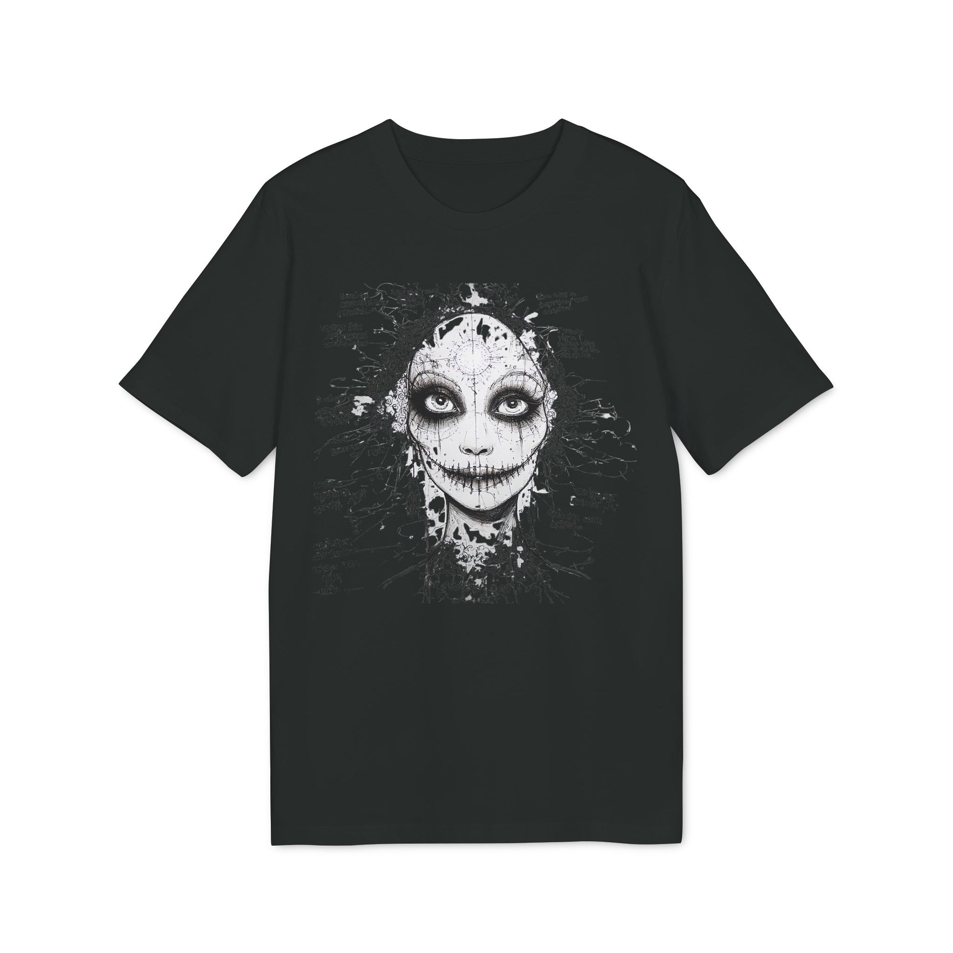 This eco-friendly unisex T-shirt features a haunting stitched-smile portrait, a surreal figure whose wide, unsettling grin collides with grotesque elegance. Scribbled notes and chaotic details add layers of meaning — like a diary of madness stitched into fabric.